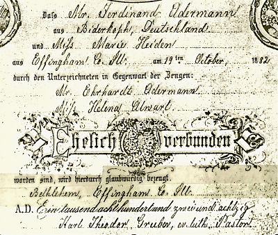 When Ferdinand was 23 years old, two years before he became a naturalized citizen, he married Marie (Mary) Heiden of Bethlehem, Effingham County, Illinois. The date was October 19, 1882.