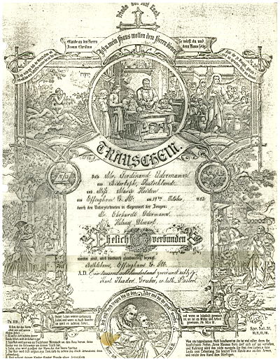 Their marriage certificate is in German and states that “Karl Theodor Gruber, ev. luth [sic], Pastor” presided at their wedding. Mr. Ehrhardt Adermann was a witness to the vows as was Mifs. Helena Alwart. Mary’s mother’s maiden name was Margaret Alwerdt (Alwart). Possibly Helena was a cousin.