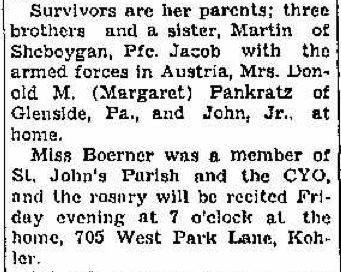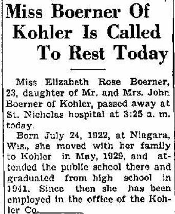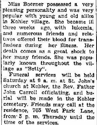 Martin and Katherine Boerner’s oldest son, John, went back to Germany to marry his cousin Hildegard Boerner. John and Hilda moved to Kohler, WI from Niagara, WI with their children in May 1929. They had five children who grew to adulthood. Elizabeth, their fourth-born, died at the age of 23 from leukemia. Here is the notice of her death in the Sheboygan newspaper.