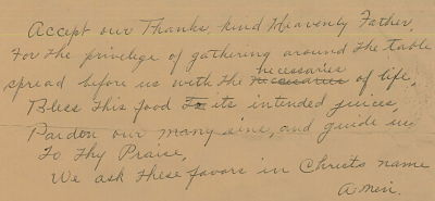 Accept our thanks, kind Heavenly Father, for the privilege of gathering around the table spread before us with the necessaries of life. Bless this food to its intended juices, pardon our many sins, and guide us to Thy praise. We ask these favors in Christ’ name. Amen.