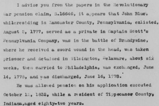 John S. Blue entered the Continental Army on August 2, 1777 in Elizabeth Town, Lancaster County, PA. He fought in the Battle of Brandywine on September 11, 1777 (with Gen. George Washington as his highest ranking officer) where he was wounded in the head by a sword. He was captured that day and was a prisoner of war until June 14, 1778. He was then discharged two days later. Fold 3 has his Revolutionary War Pension information online; following is the most legible letter, typed in 1929 to a family genealogist confirming his experience: