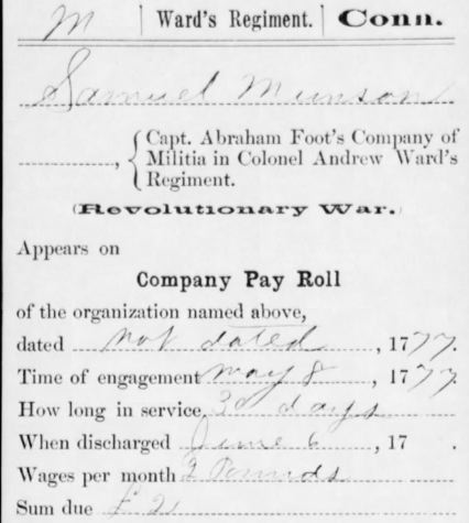 son of Samuel Munson (Oct 7, 1739 – April 2, 1827) who served in Captain Abraham Foot’s Company, Ward’s Regiment from Connecticut, led by Col. Andrew Ward: