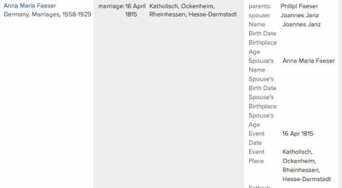 Today we celebrate the marriage of my 3rd great-grandparents, Anna Mariae Faeser and Johannes Janz. The joined in the Roman Catholic Church in Ockenheim, Rheinhessen, Hesse-Darmstadt on 16 April 1815.